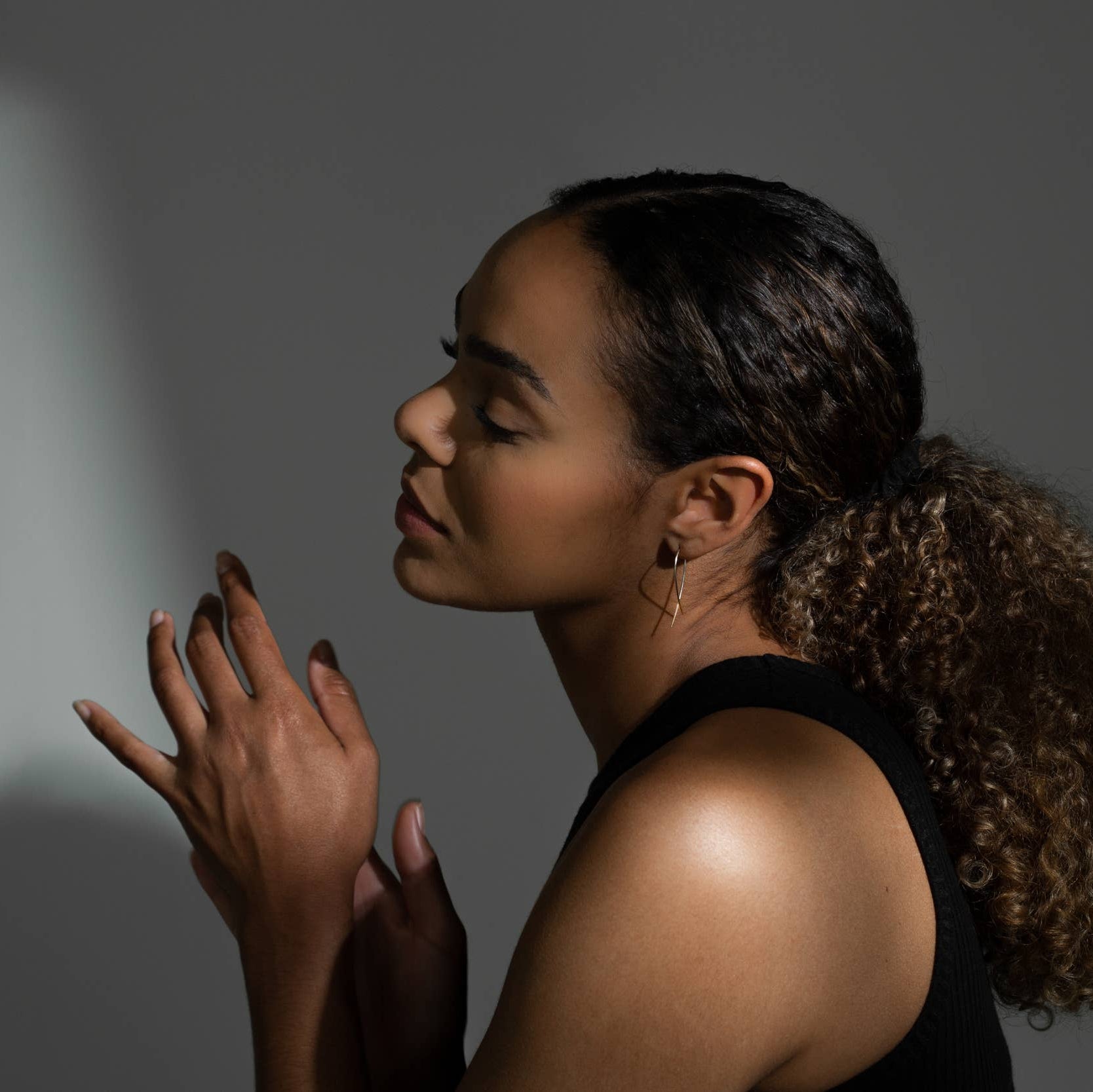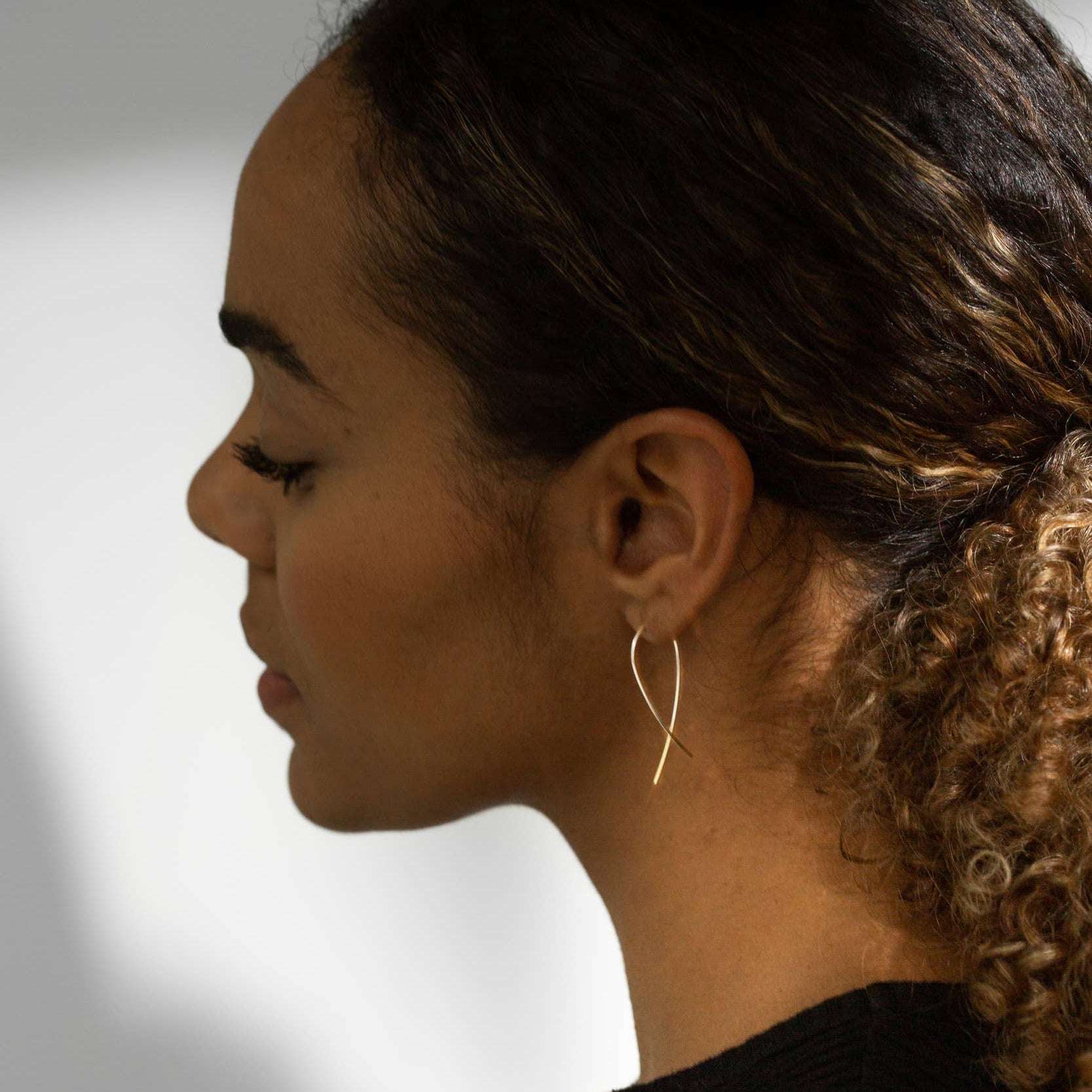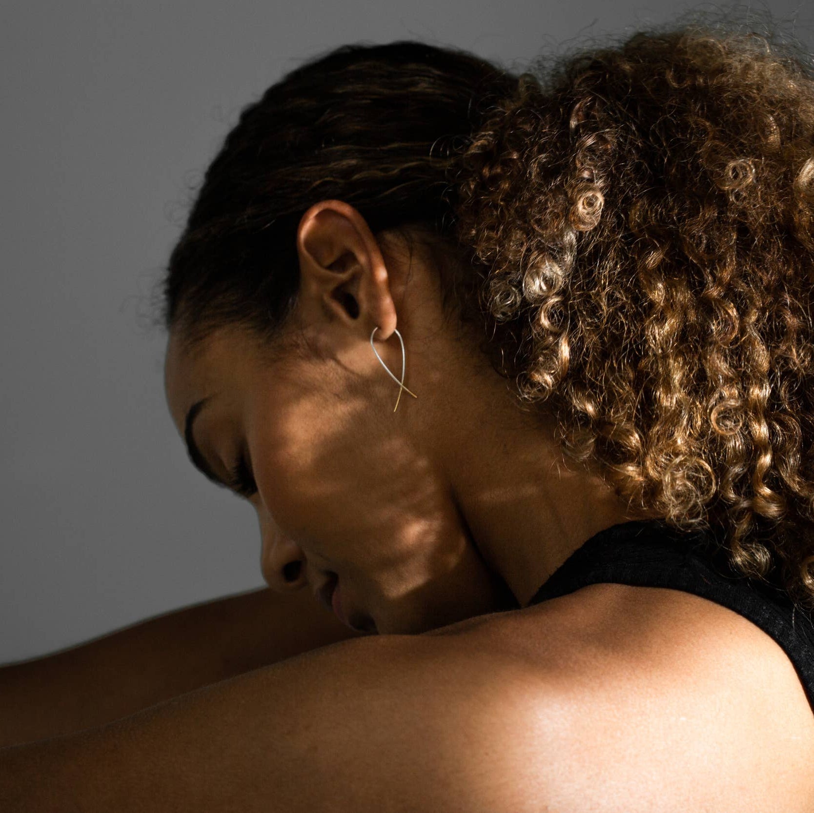 A bestseller, these elegant earrings combine simplicity with contemporary style. Crafted from fine silver with gold-dipped ends, they measure 40mm and feature a secure crossover design that loops effortlessly through the ear—no clasps needed.