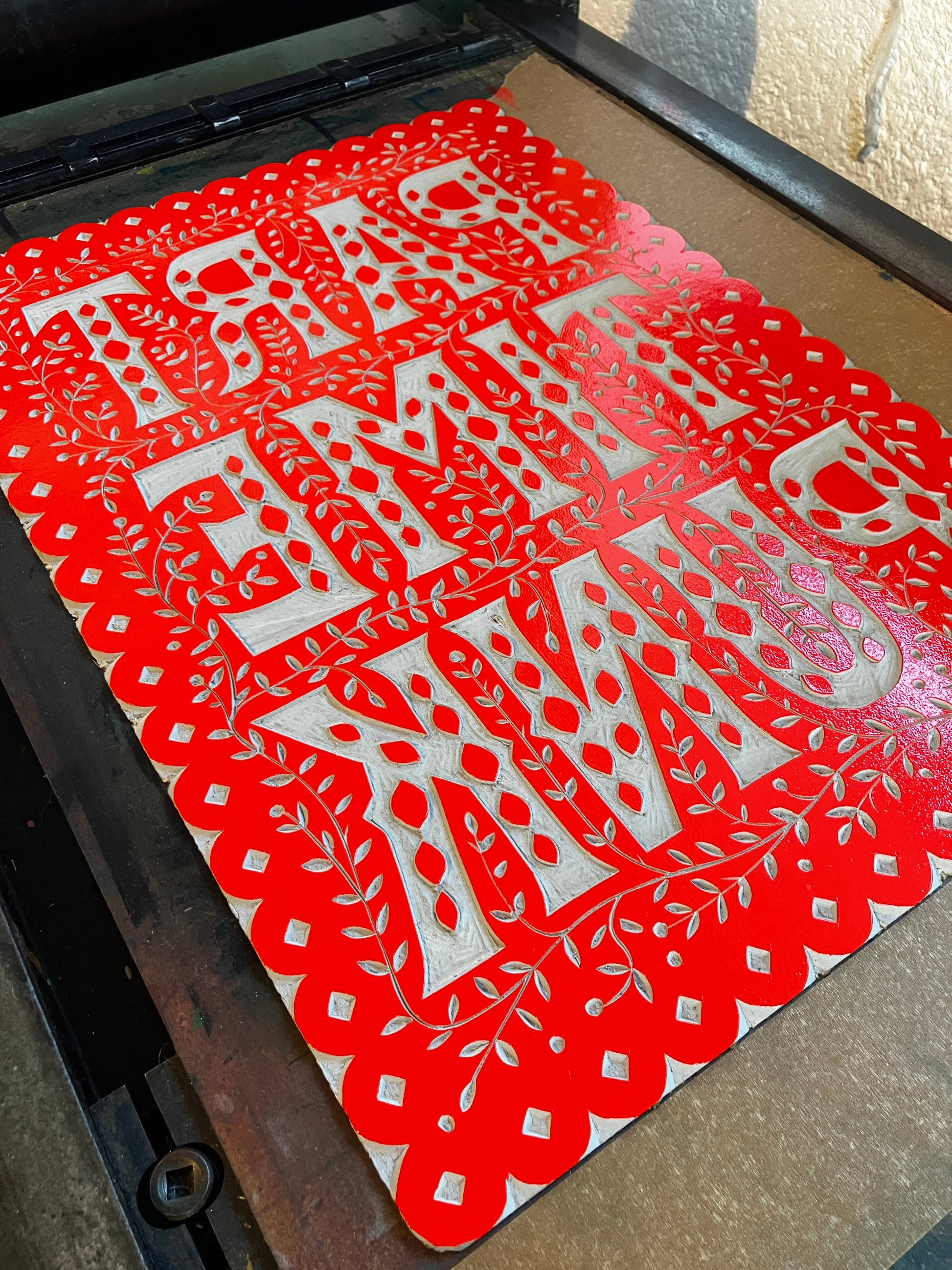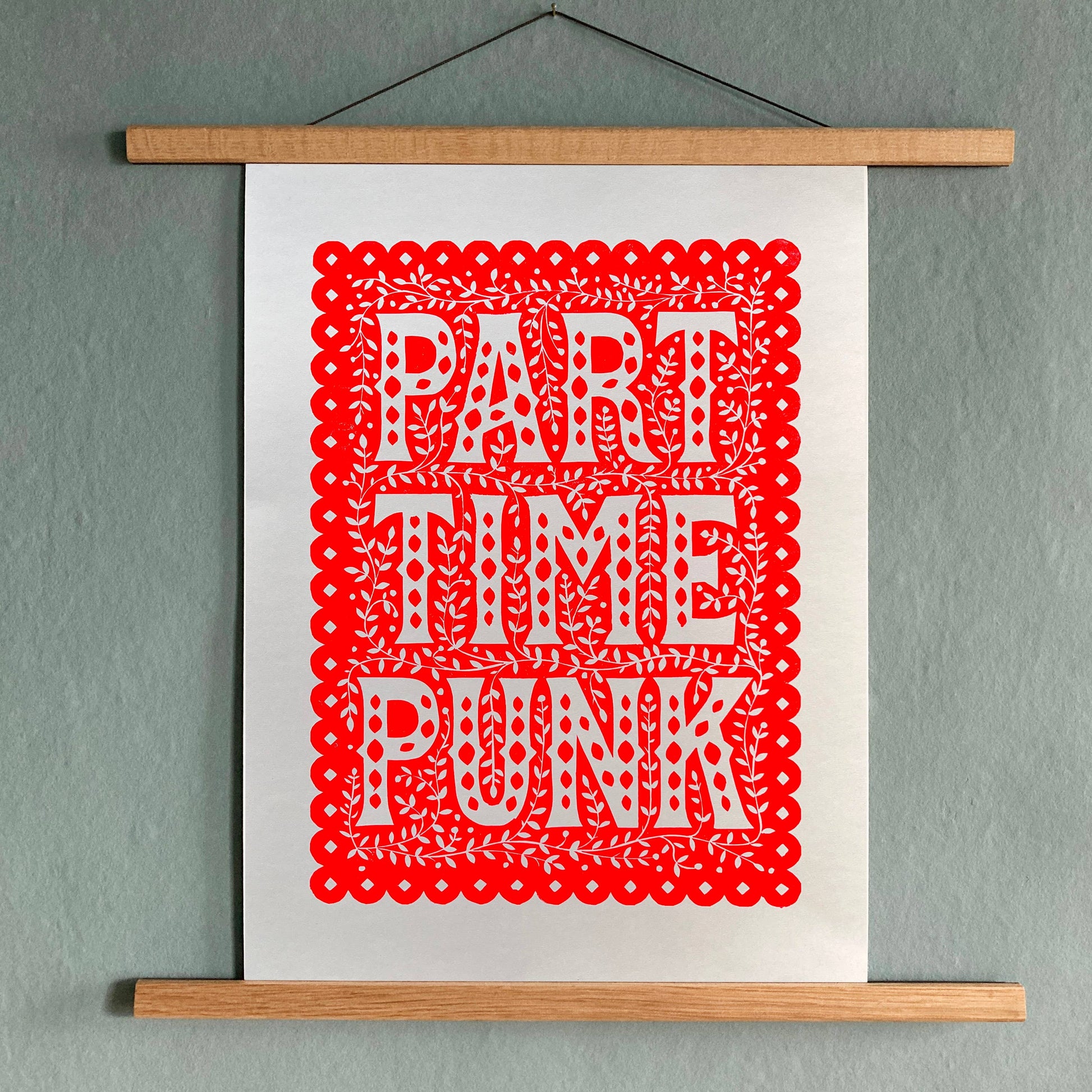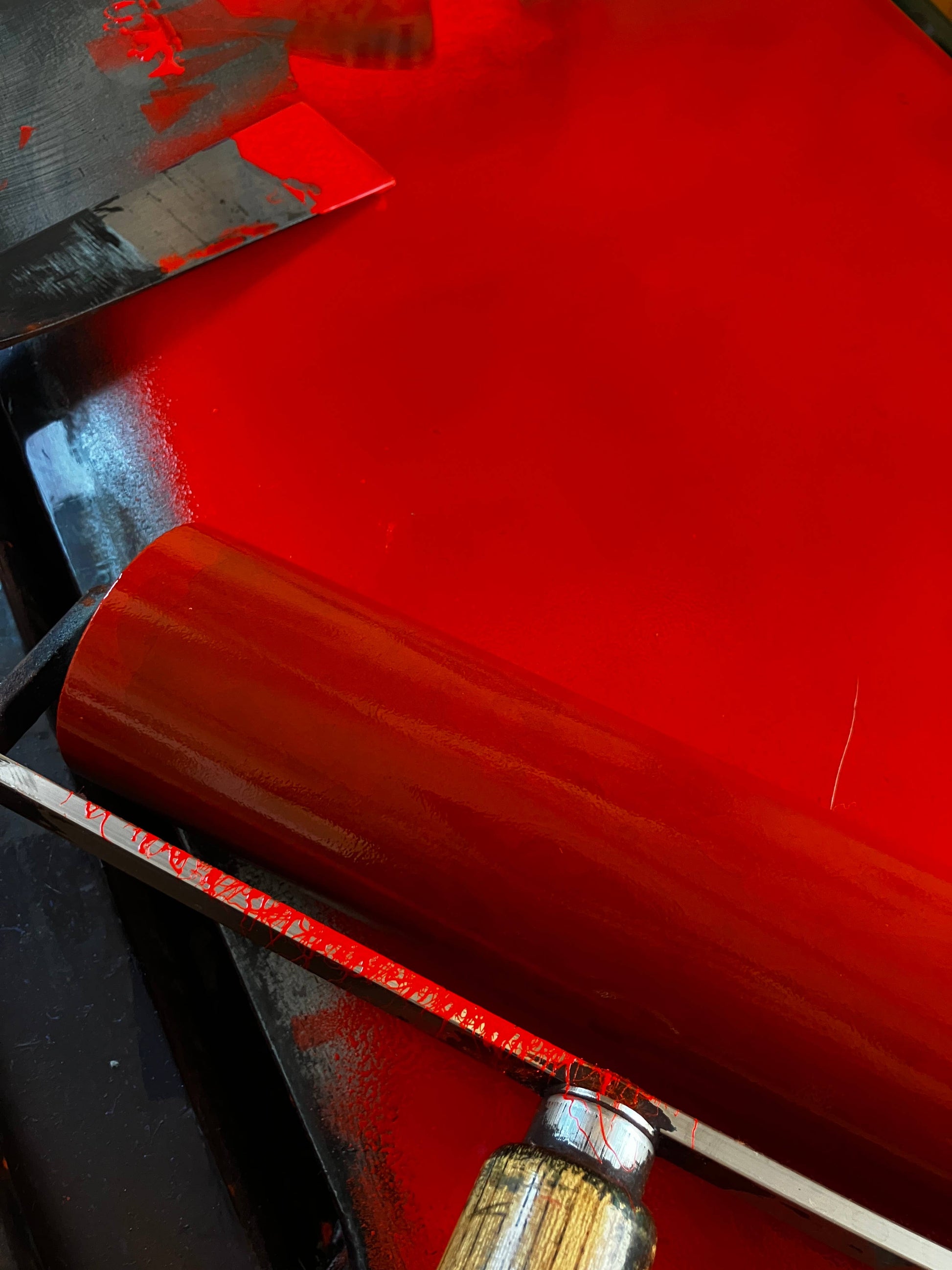 One colour linocut printed in a zingy fluorescent red by James Brown