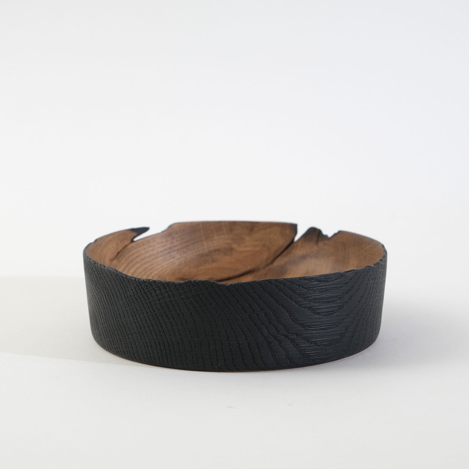 Turned in English Oak, this beautiful bowl has been finished by using blowtorches to char the timber’s outer surface, allowing the sharp rim to burn and smoulder. This creates an uneven, organic finish. Knots and fissures enhance the natural character and texture of the piece. A beautiful bowl with a comfortable contrast between the natural and charred wood.
